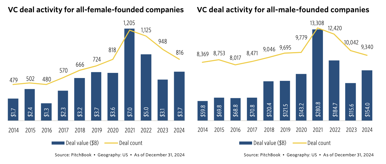In reality, female-founded companies (including mixed-gender teams) captured about 20% of U.S. venture deal activity in 2024, roughly $38B across 816 deals (PitchBook).